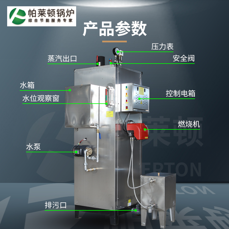 帕萊頓燃油燃?xì)馊詣?dòng)蒸汽發(fā)生器產(chǎn)品設(shè)計(jì)制造、檢驗(yàn)嚴(yán)格按照國(guó)家標(biāo)準(zhǔn),本體采用優(yōu)質(zhì)鍋爐鋼制成,給水泵采用壓力大、噪聲低的高溫高壓旋渦泵。爐內(nèi)設(shè)有水位控制,加熱加水自動(dòng)轉(zhuǎn)換。本系列產(chǎn)品設(shè)計(jì)電路,易于清洗,易于上水;體積小、熱效率高、安裝、移動(dòng)使用方便快捷。具備操作簡(jiǎn)單 、上汽快、智能變頻精準(zhǔn)控制三大優(yōu)勢(shì),極大減少了能源浪費(fèi),達(dá)到節(jié)能效果;開(kāi)機(jī)后3-5分鐘出蒸汽,啟動(dòng)階段節(jié)能接近100%;